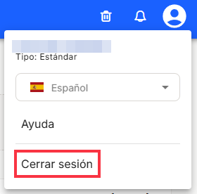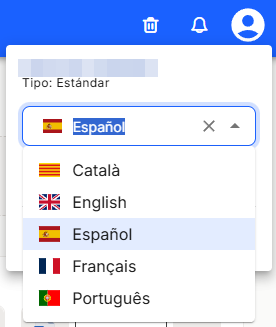 Vous pouvez voir le nom attribué à l'utilisateur qui s'est connecté à la plateforme, le type d'utilisateur avec lequel il a été enregistré et les autorisations correspondantes, ainsi qu'un menu déroulant dans lequel vous pouvez choisir la langue dans laquelle tous les menus et options de l'application seront affichés.