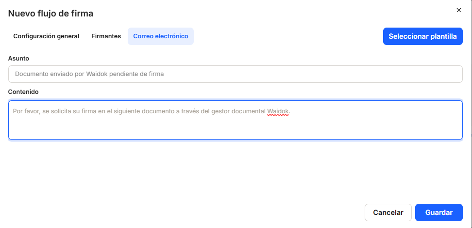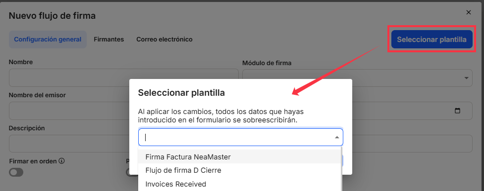 La deuxième option, Publier comme modèle, nous permet de publier (enregistrer) le flux comme modèle afin de l'utiliser ultérieurement dans d'autres documents. Si nous avons déjà des modèles enregistrés et que nous souhaitons les utiliser, il suffit de cliquer sur le bouton Sélectionner un modèle dans la fenêtre du nouveau flux, et nous pourrons choisir celui que nous voulons pour démarrer le flux.