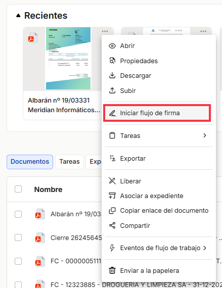 À partir du menu contextuel d'un document, vous pouvez lancer un flux de signature qualifiée d'un document. Ce module est supplémentaire et doit être souscrit séparément pour pouvoir utiliser cette fonctionnalité. De plus, le document doit nécessairement être au format encapsulé (PDF) ne permettant pas son édition pour que la signature soit valide.