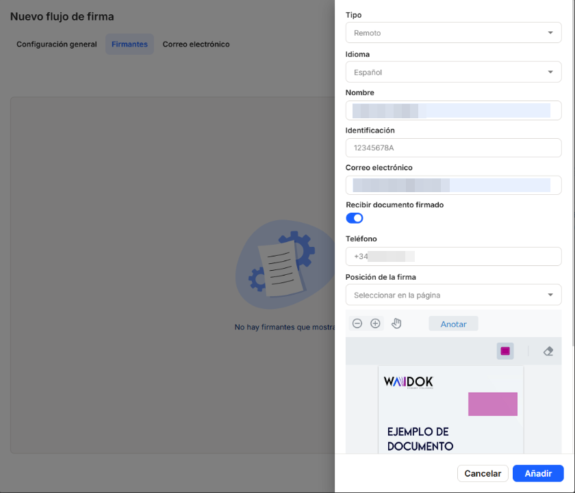 Lorsque vous lancez un flux de signature à distance, la fenêtre de configuration du nouveau flux que vous allez lancer s'affiche.
