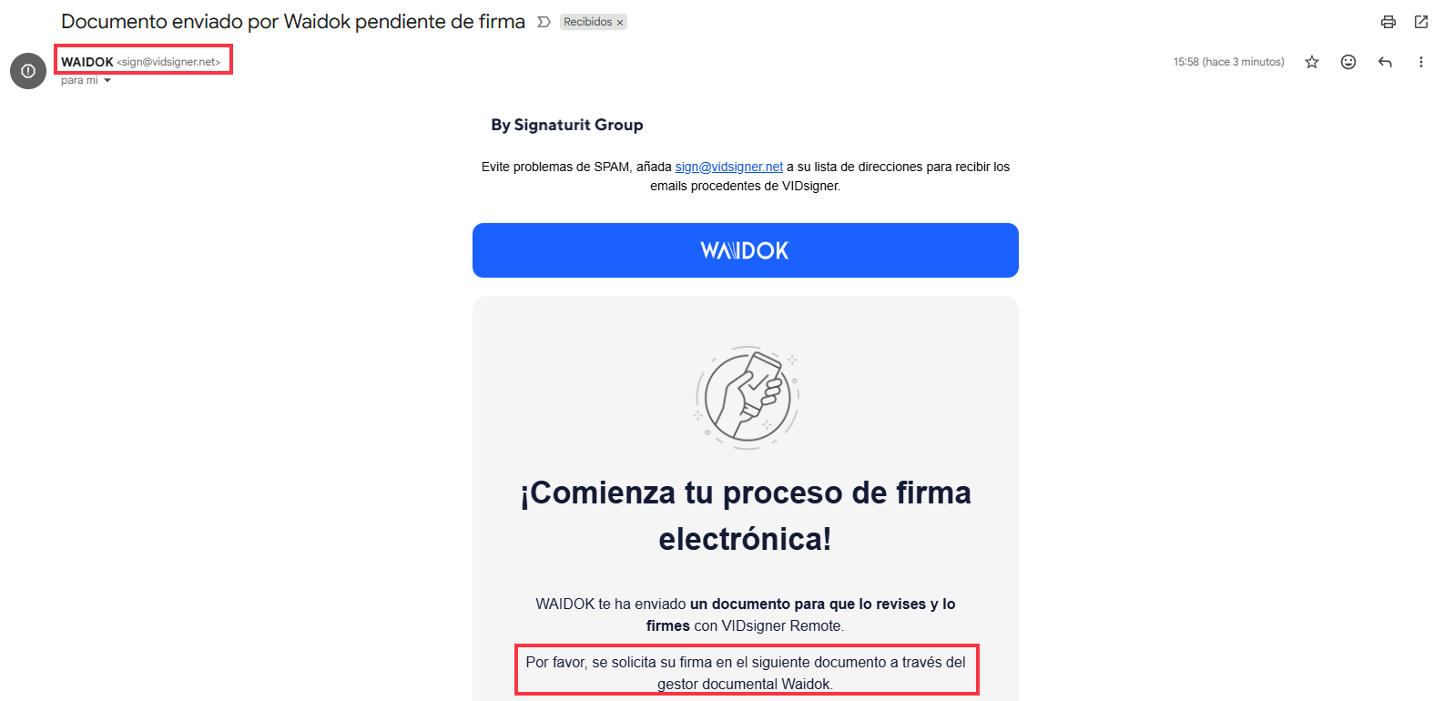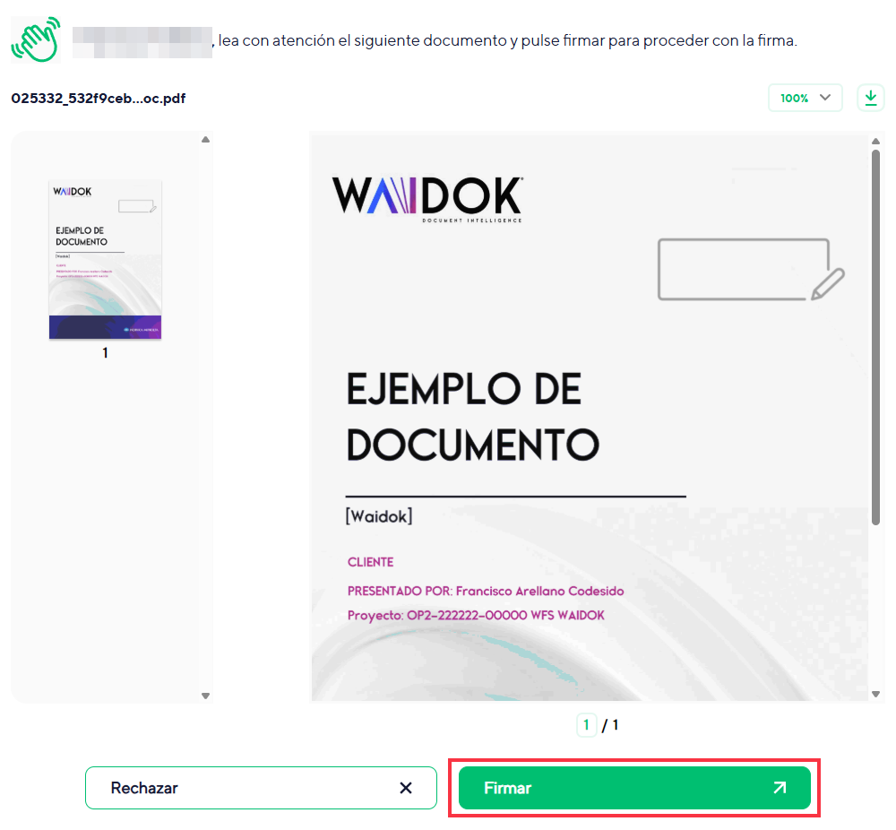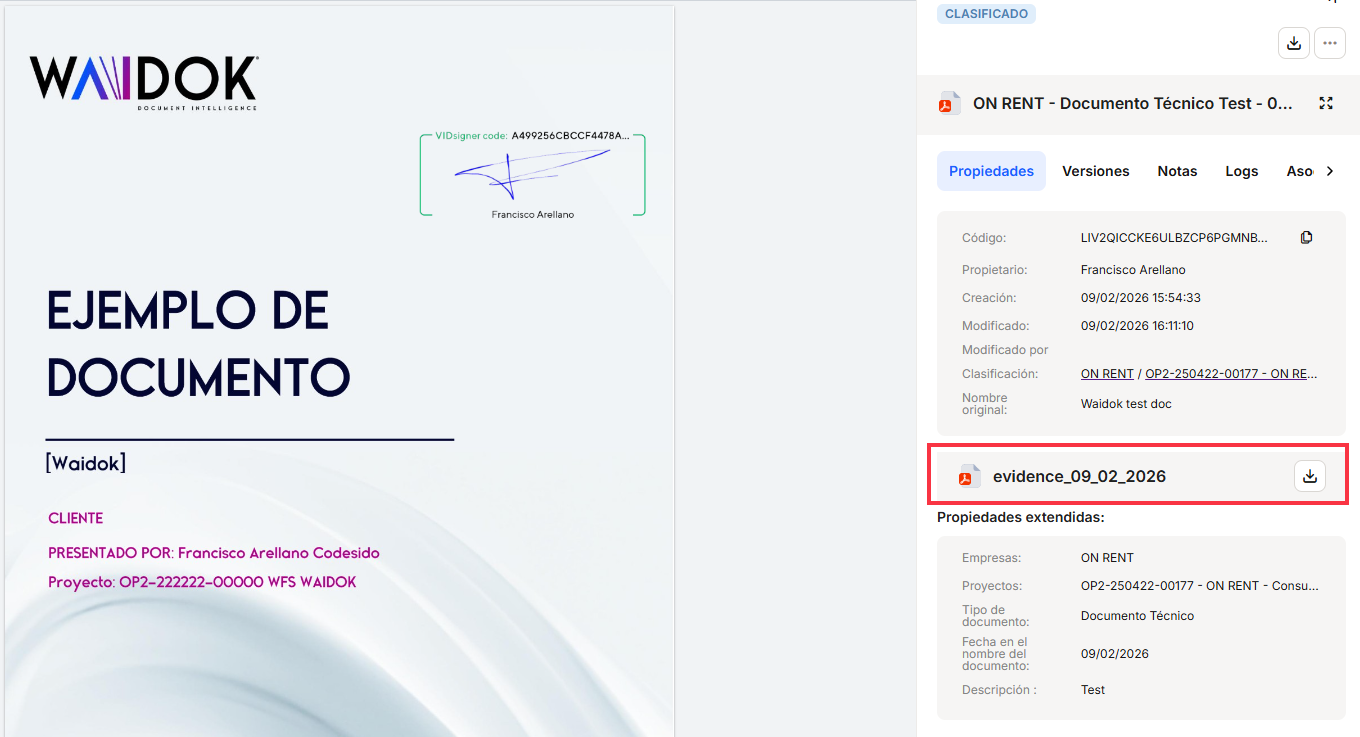 Une fois le flux terminé, le document apparaîtra dans la console de signature avec le statut Correct et, dans Waidok, nous disposerons déjà du document mis à jour avec la signature (si elle est visible, elle apparaîtra également dans les miniatures du document).