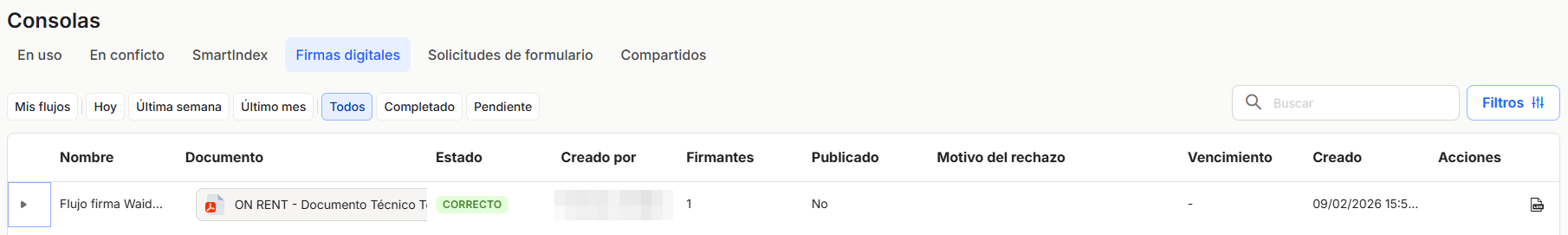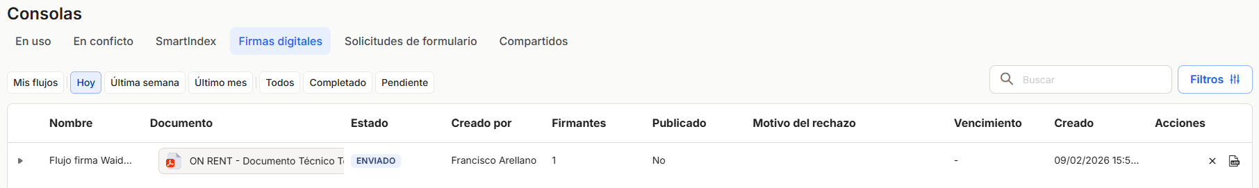Une fois le processus de création du flux terminé et enregistré, le processus de signature sélectionné commencera. Dans le cas de l'exemple, une nouvelle ligne apparaîtra dans la console Signatures numériques (voir la section spécifique pour voir toutes les options) avec le statut Envoyé.
