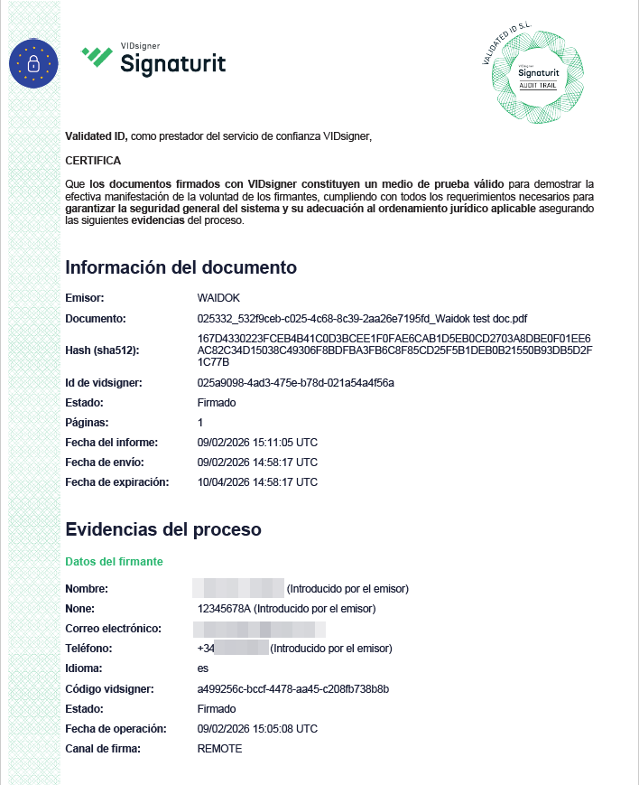De plus, le service de signature nous fournira un document justificatif qui sera associé au document signé et contiendra toutes les informations relatives à la signature : lieu, adresse IP, date et heure, etc. Selon le type de signature (biométrique, à distance, centralisée, etc.), les informations justificatives peuvent varier légèrement d'un document à l'autre.