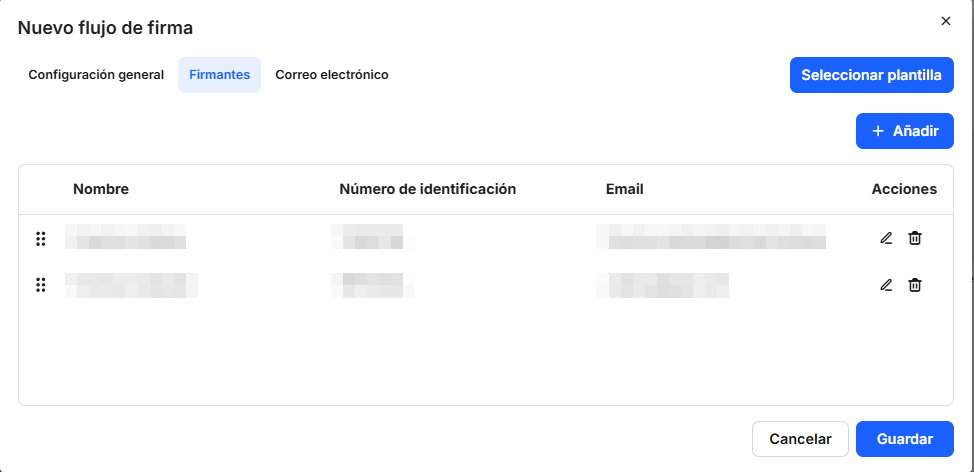 Dans cette fenêtre, vous pouvez vérifier les informations et l'ordre des signataires qui sont ajoutés au document. À partir du tableau, vous pouvez modifier leur ordre, modifier leurs informations et les supprimer.