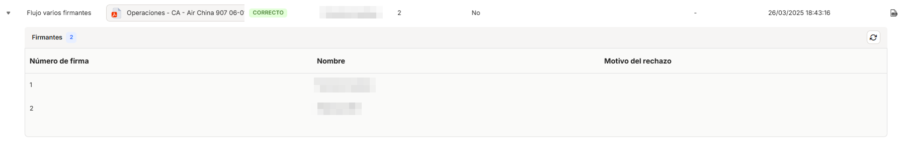 S'il y a plusieurs signataires dans le flux, nous pourrons suivre l'état de chacune des signatures et, le cas échéant, connaître la raison du refus des signataires.