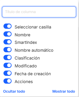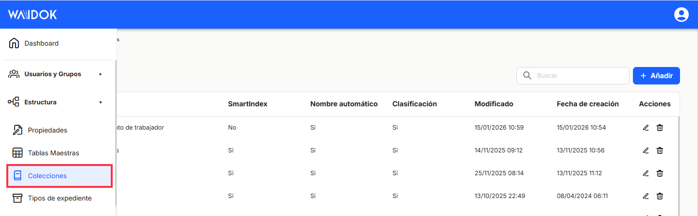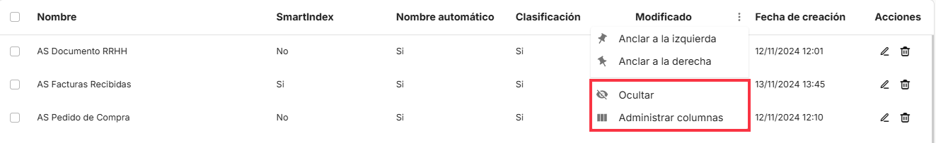 Comme pour le reste des options de tri de l'application, l'affichage d'un tableau contenant la liste des propriétés des collections fera apparaître différentes colonnes, telles que "Nom", "SmartIndex" (connecté au module d'OCR et de vérification), "Nom Automatique", "Classement", "Dernière modification" (date), "Date de création".y "Actions"qui contient les options directes des raccourcis "éditer"