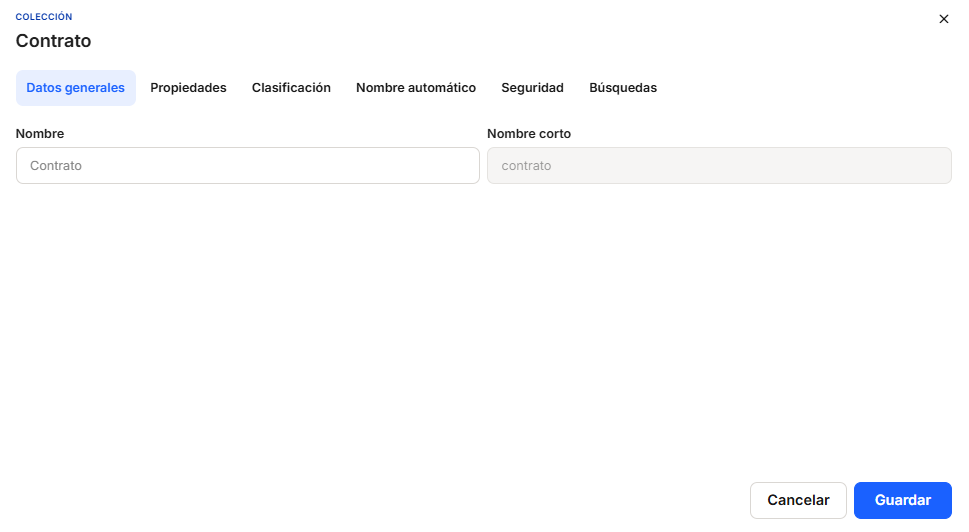En accédant à cette section, les utilisateurs pourront voir dans un tableau la liste de toutes les collections qui ont été définies, de sorte que les documents insérés dans le système sont classés dans la collection déterminée par l'utilisateur, soit à partir du téléchargement manuel, soit à partir du téléchargement automatique. Dans cette section, de nouvelles collections et leurs caractéristiques peuvent être ajoutées à l'application avec les données nécessaires, la recherche et/ou l'affichage de la liste de toutes les propriétés actuelles, une série de champs (propriétés) ainsi que des options de tri et des actions à exécuter.