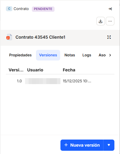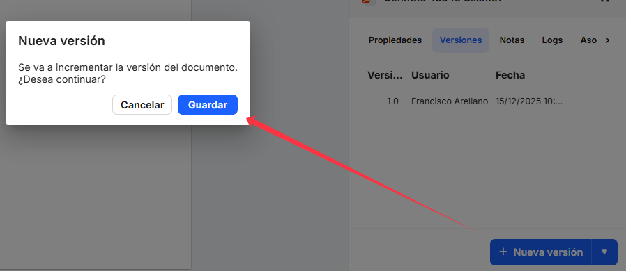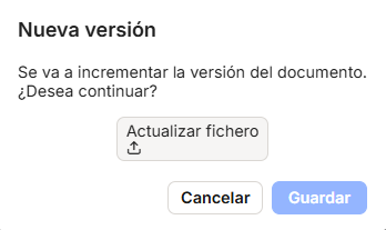 Le bouton « + Nouvelle version » permet de générer automatiquement et de manière séquentielle une nouvelle version du document après la dernière enregistrée dans le système. La numérotation augmentera à partir de la version initiale (par défaut 1.0), puis 1.1, 1.2, et ainsi de suite.