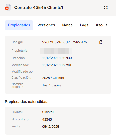 Les propriétés de base affichent des données telles que le "Code", qui est une combinaison alphanumérique automatique générée par l'application et attribuée au document pour son identification univoque, qui avec l'icône de copie