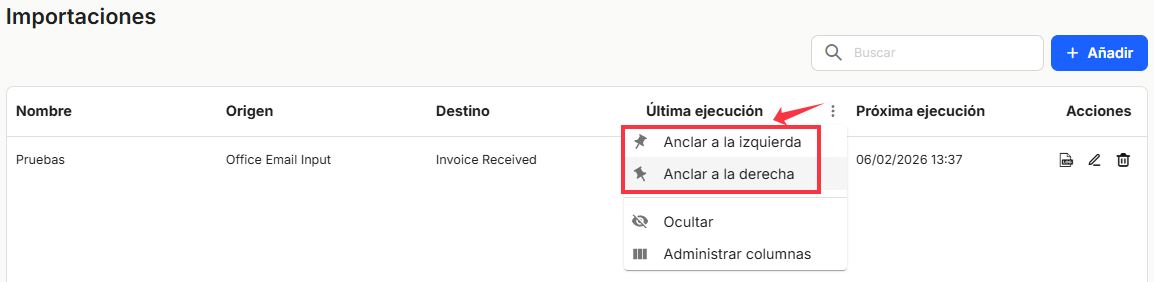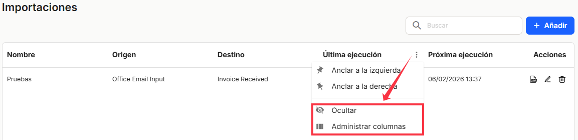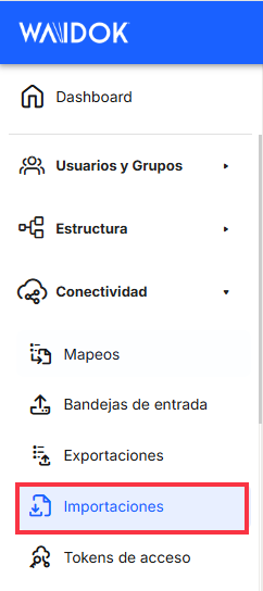 Dans cette section, les utilisateurs pourront voir dans un tableau la liste de toutes les importations qui ont été effectuées. Dans cette section, l'utilisateur pourra connaître et définir les importations de documents, dont la source sera les pièces jointes des courriers électroniques validés dans l'application. Les importations de documents attachés à des courriers électroniques seront incorporées directement dans l'une des boîtes de réception préalablement définies dans l'application, pour être ensuite incorporées dans les collections ou les fichiers déterminés. L'utilisation principale de cette fonctionnalité est d'obtenir et d'incorporer automatiquement dans l'application des documents attachés à des courriels qui se répètent régulièrement dans le temps.