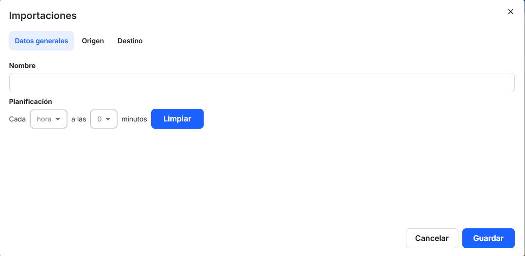 Sous "Données générales", vous devez définir le "nom" de l'importation, ainsi que le "calendrier" ou la périodicité de l'exécution de l'importation générée.
